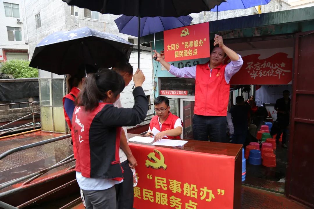 成立“大同库区村级政务服务中心” “农事船办”,“绿色通道”暖民心。针对独特的地理环境和库区群众较多的实际情况,大同乡创造性的将“农事村办”延伸到“农事船办”上,利用库区移民坐船赶圩的1至2个小时时间,组织志愿服务队到船上开展宣讲、为民办事,实现党课船上讲、业务船上办、证明船上拿、有苦船上诉,让“农事船办”成为通民情暖民心的“绿色通道”,实现“办事不用跑、服务送上门”。“农事船办”志愿服务活动开展以来,共出动志愿者250人次,接待库区群众400多人次,调解矛盾纠纷230多件,办实事350多件(次),有力促进库区社会和谐稳定,进一步密切干群关系。