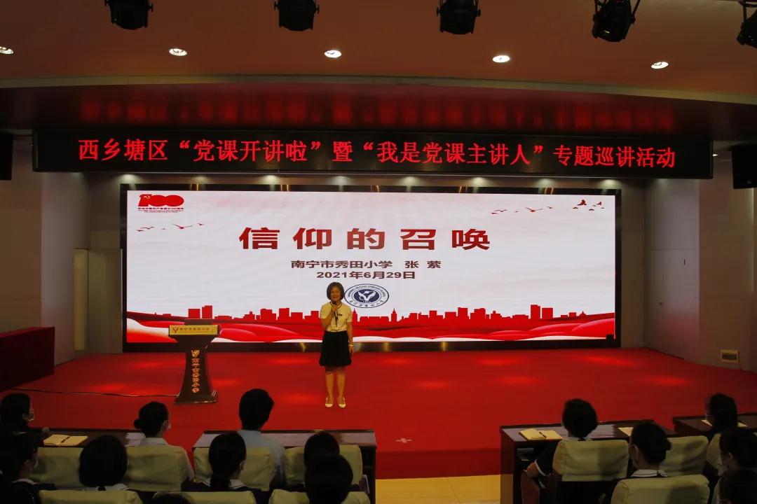 原标题: 南宁市西乡塘区开展“党课开讲啦”暨“我是党课主讲人”专题巡讲活动 百年梦想,百年追求,为隆重庆祝中国共产党建党100周年,6月29日下午,西乡塘区“党课开讲啦”暨“我是党课主讲人”专题巡讲活动在南宁市秀田小学芬芳楼多功能厅开展。此次党课由自治区“百佳优秀党课”获得者南宁市秀田小学张萦校长主讲,主题是“信仰的召唤”。六校区全体教职工参加了学习,西乡塘区委组织部李如卿副部长、远程办韦春柳主任等一行三人莅临指导。